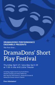 The DramaDons’ Short Play Festival runs on Thursday, Apr 27 and Saturday, Apr 29 at 7pm in the AHS Little Theatre.